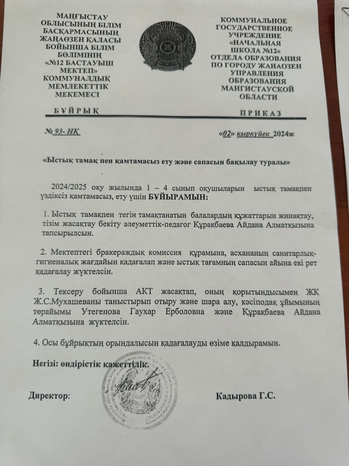 Ыстық тамақ пен қамтамасыз ету және сапасын бақылау туралы бұйрық 2023 ж