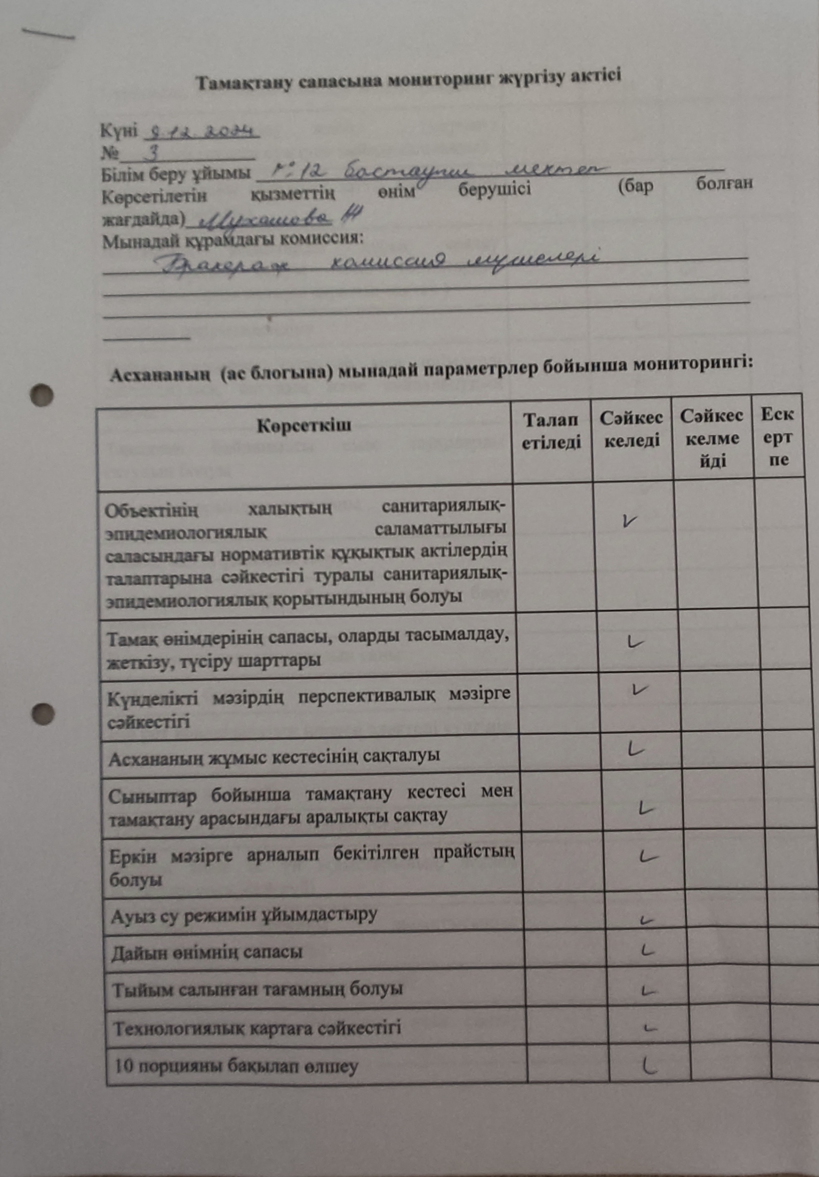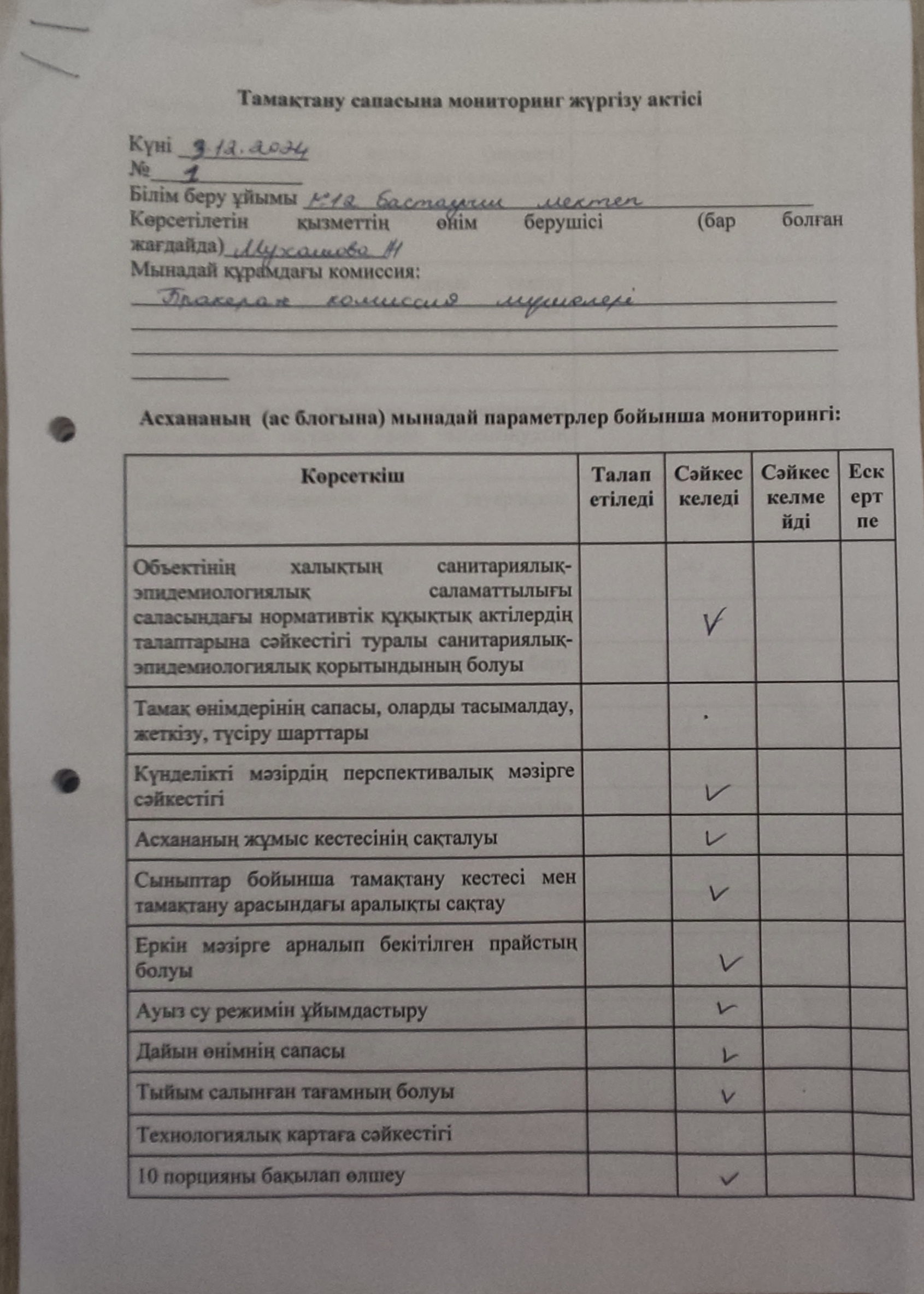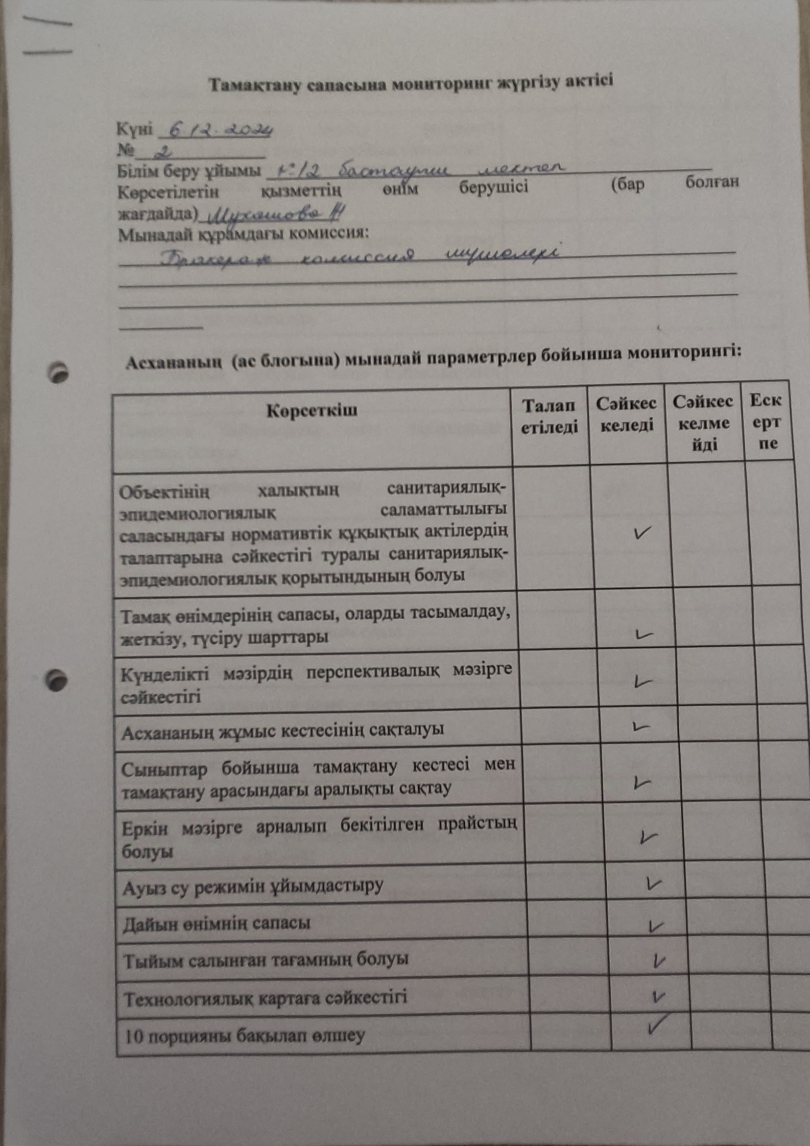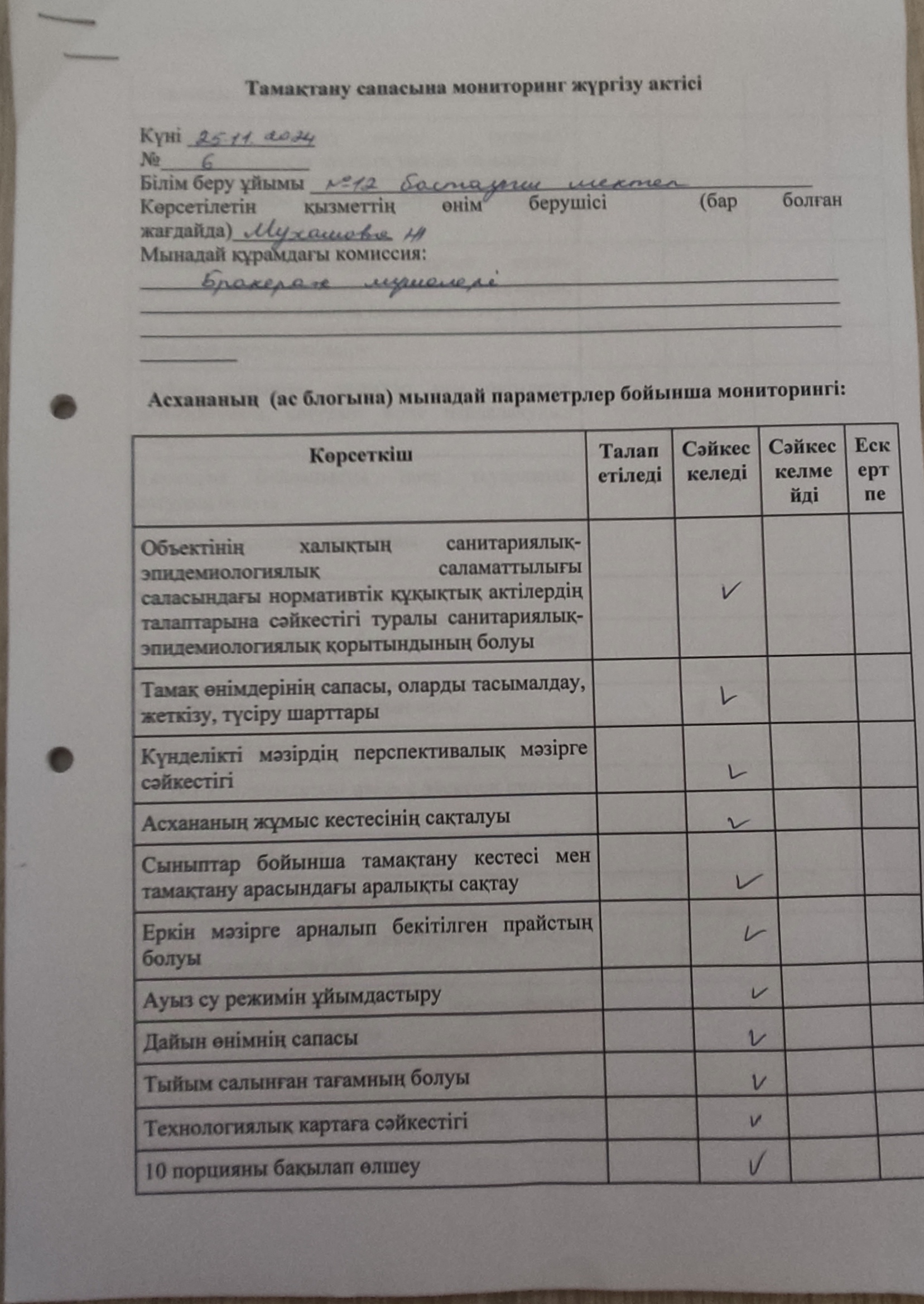Қараша айында тамақтану сапасына мониторинг жүргізу актілері