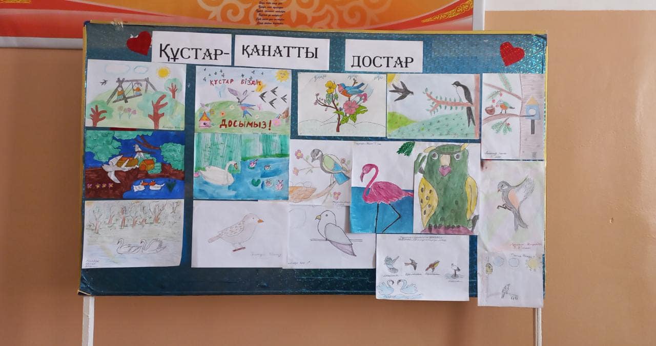 1 сәуір - Құстар күніне орай мектебімізде мектеп алды даярлық тобы тәрбиеленушілеріне "Құстар - біздің досымыз" тақырыбында бейнеролик көрсетілді. Құстардың түрлері таныстырылып, қоректенуі, өмір сүру дағдылары таныстырылды. 3-ші сыныптар арасында Усенбаева Маржан "Құстар - қанатты достар" тақырыбымен сурет көрмесін ұйымдастырды.