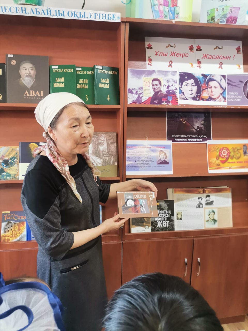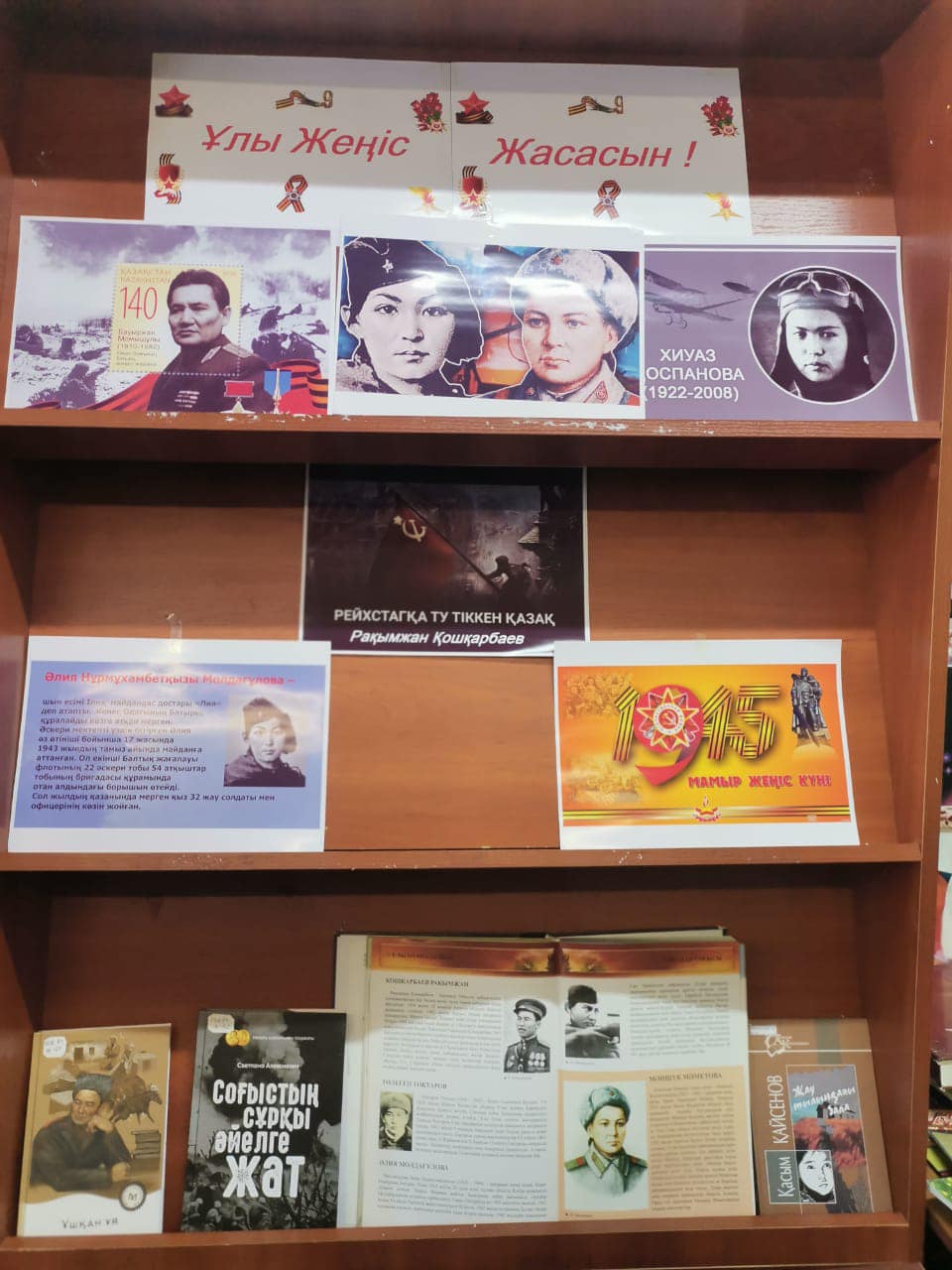 Мектеп кітапханашылары Қапарбаева А, Шамгунова Ж кітапханада "Ұлы Жеңіс жасасын!" кітап көрмесін жасақтады.