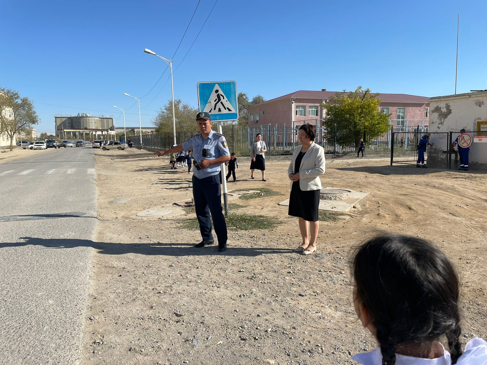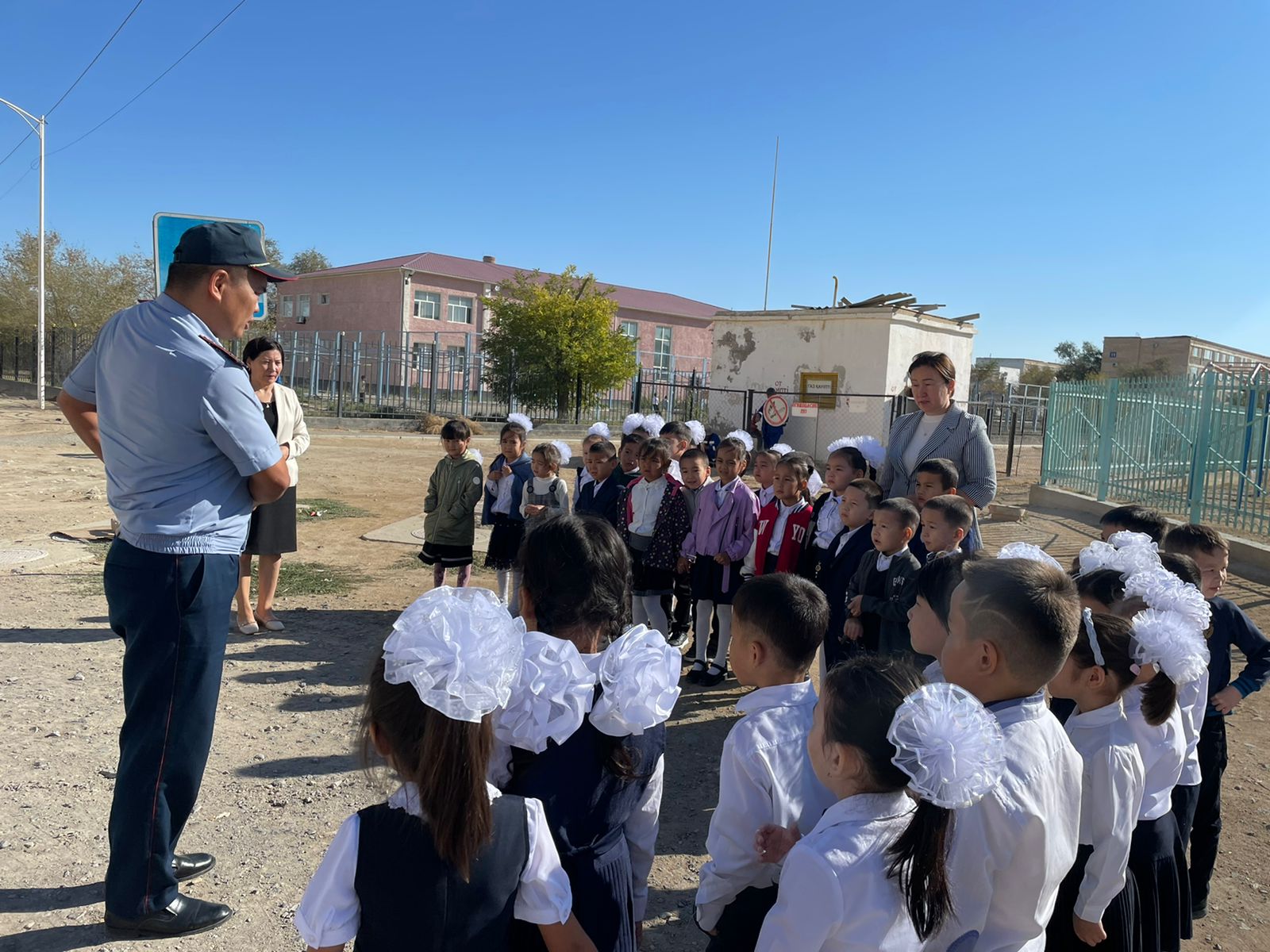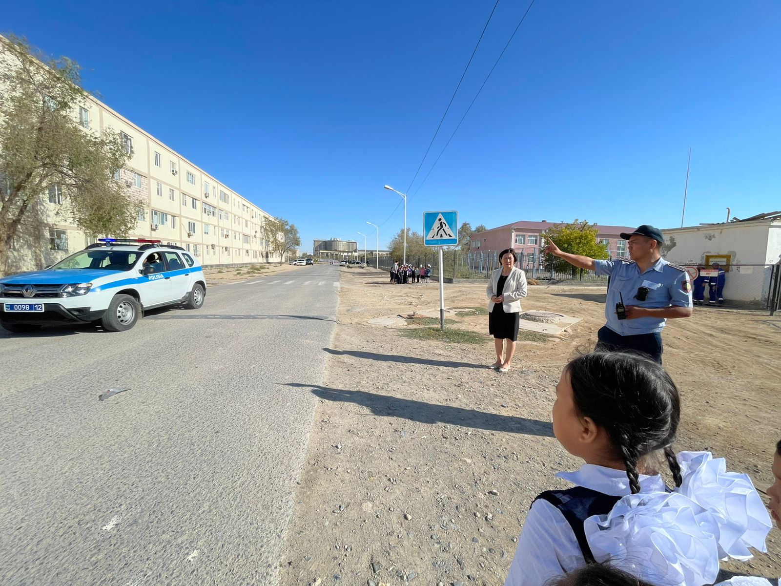 Мектебімізде өткізіліп жатырған "Абайлаңыз балалар!" акциясы бойынша тәрбие жөніндегі орынбасары Такенова А.С. және мектеп инспекторы Алибеков Б.Д. 1-ші сынып оқушыларымен "Мектепке барар қауіпсіз жол!" тақырыбында жол ережесіне байланысты мектеп айналасындағы жаяу жүргінші жолымен түсіндірме жұмыстарын жүргізді.