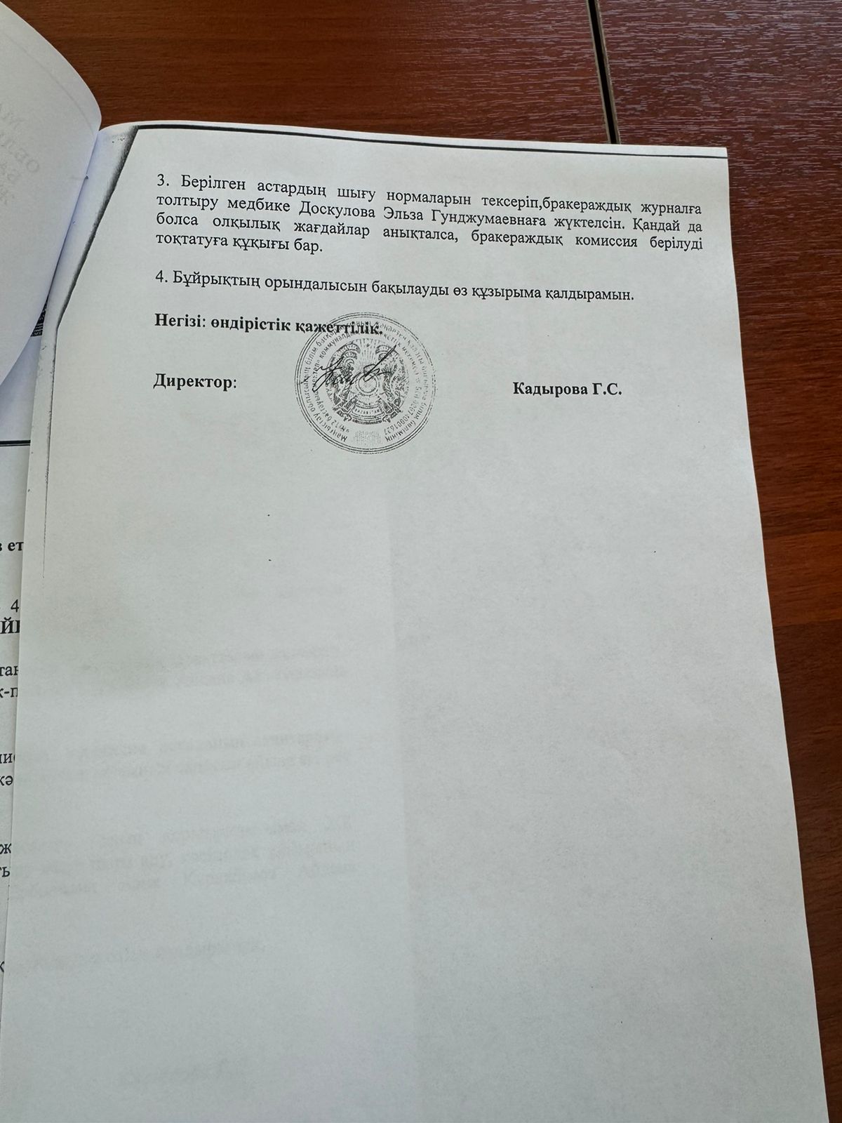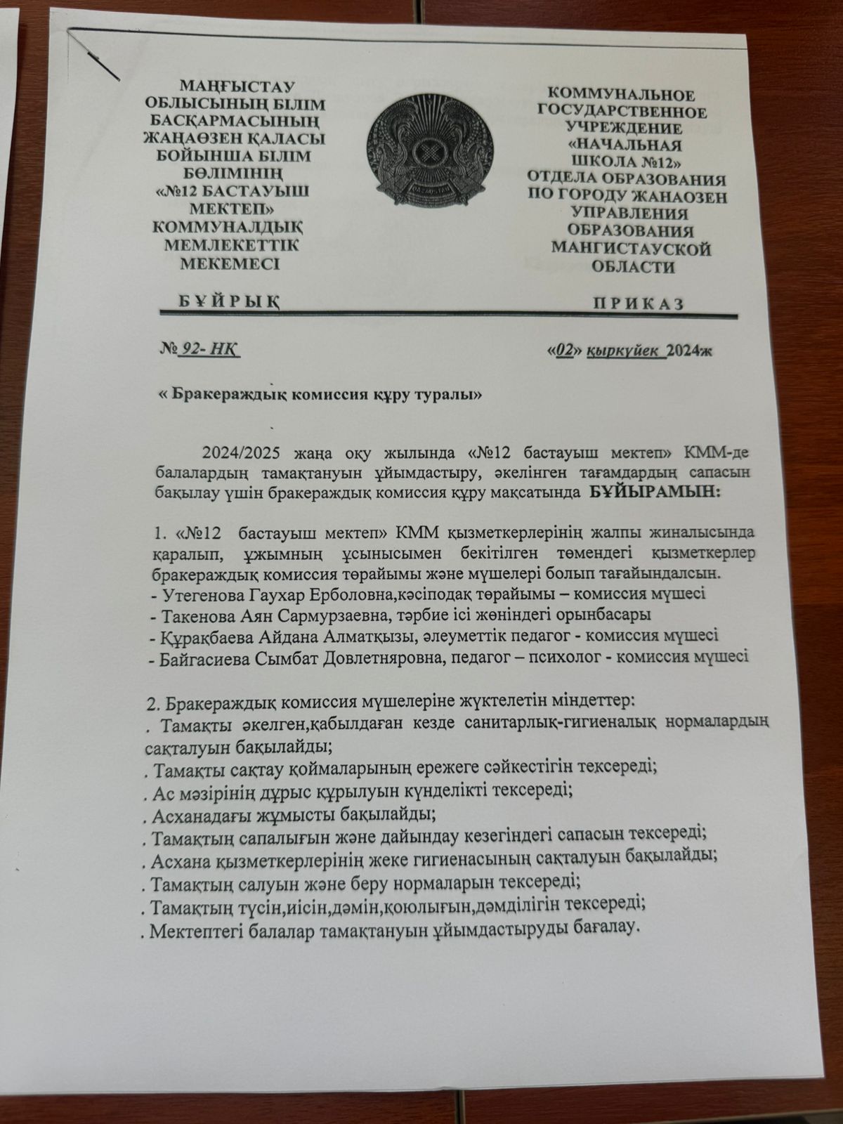 Бракераждық комиссия құру туралы бұйрық