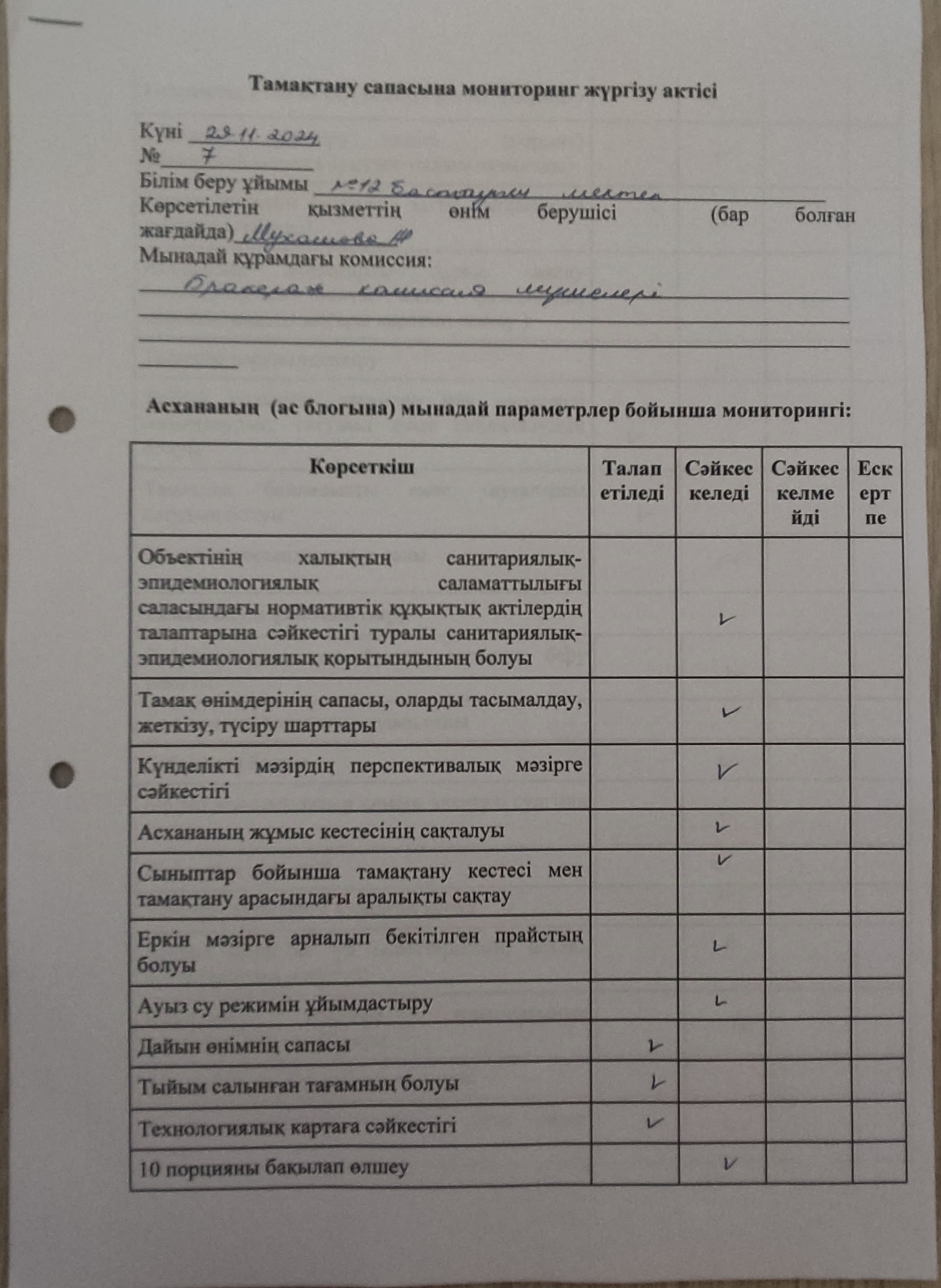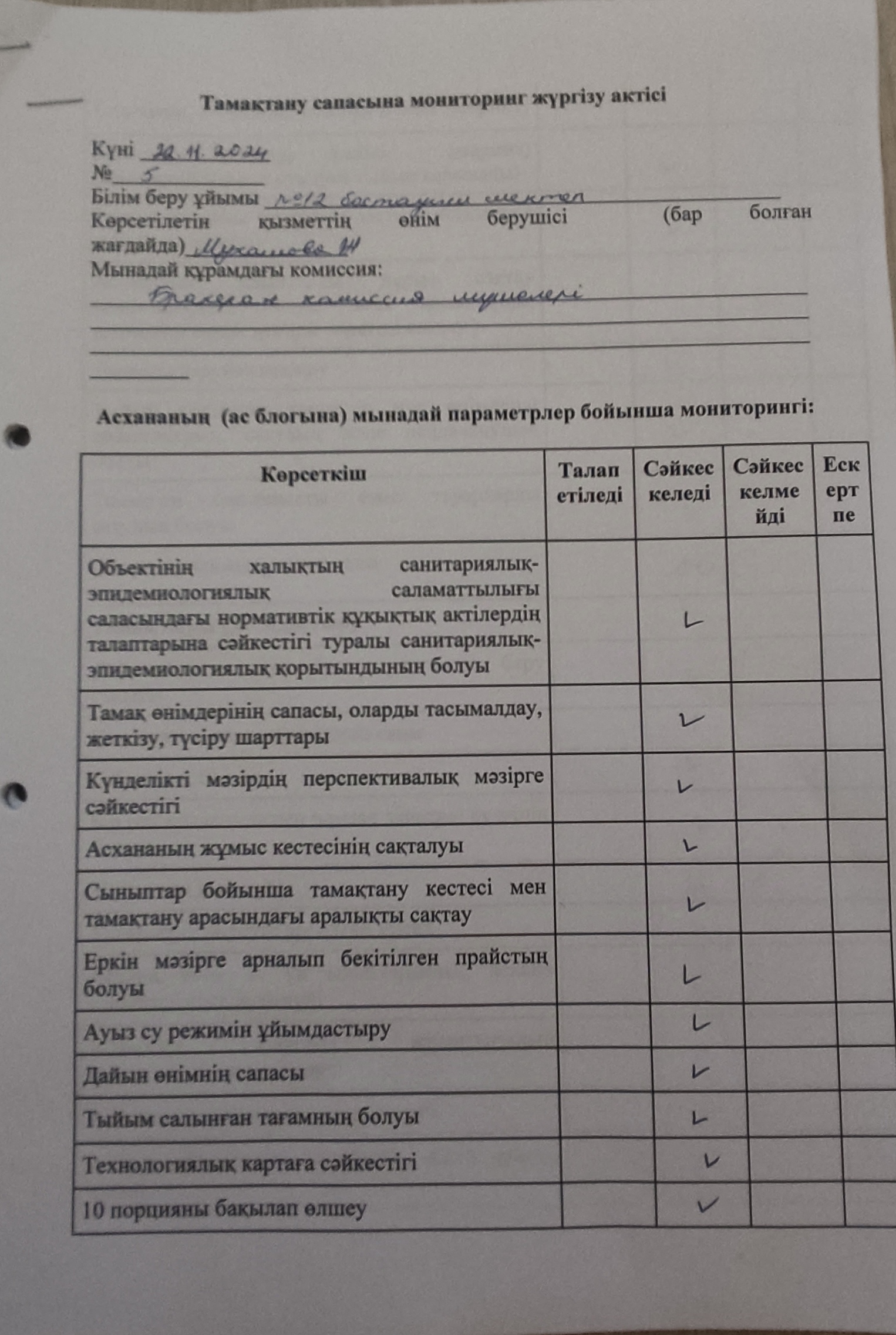 Қараша айында тамақтану сапасына мониторинг жүргізу актілері