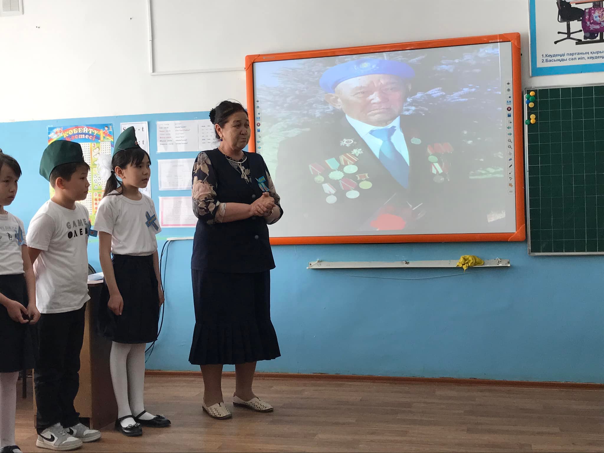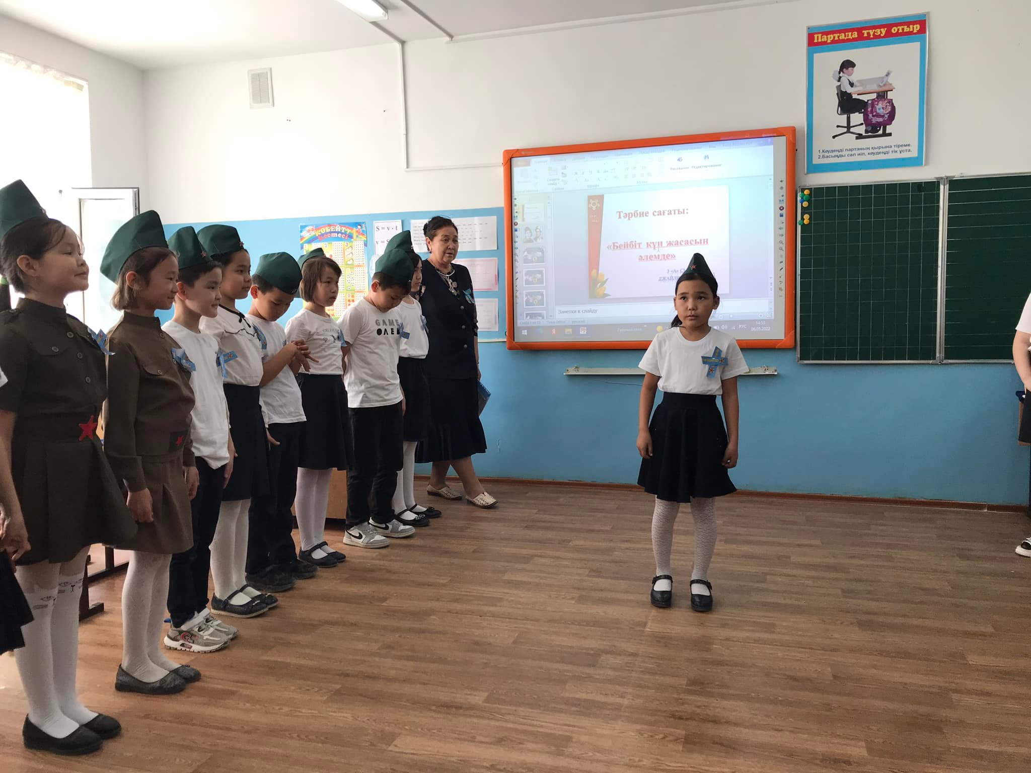 3 "А" сынып жетекшісі Джайлыбаева Нина Жеңіс күніне орай "Бейбіт күн жасасын әлемде!" тақырыбымен тәрбие сағатын өткізді. Ұлы Отан соғысына қатысқан Қазақстандық батырлар, 28 Панфиловшылар дивизиясы туралы әңгімелеп, оқушылар тақпақтар мен әндер айтты.