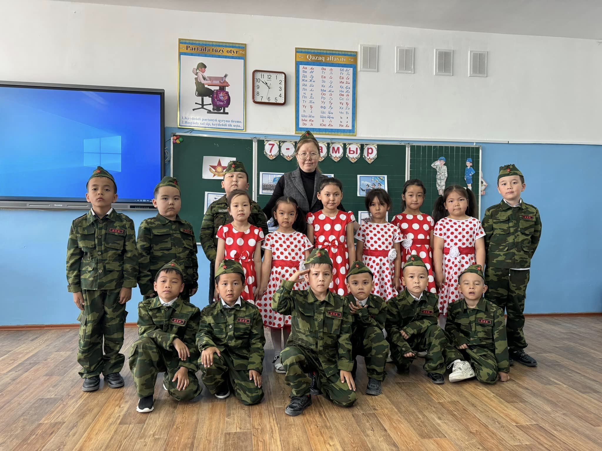 1-ші "Д" сынып жетекшісі Қыдырбаева Жазира сыныбымен 9 мамыр - Жеңіс күніне байланысты "Ұлттық әскер тәуелсіздік тірегі" тақырыбында тәрбие сағатын өткізді.