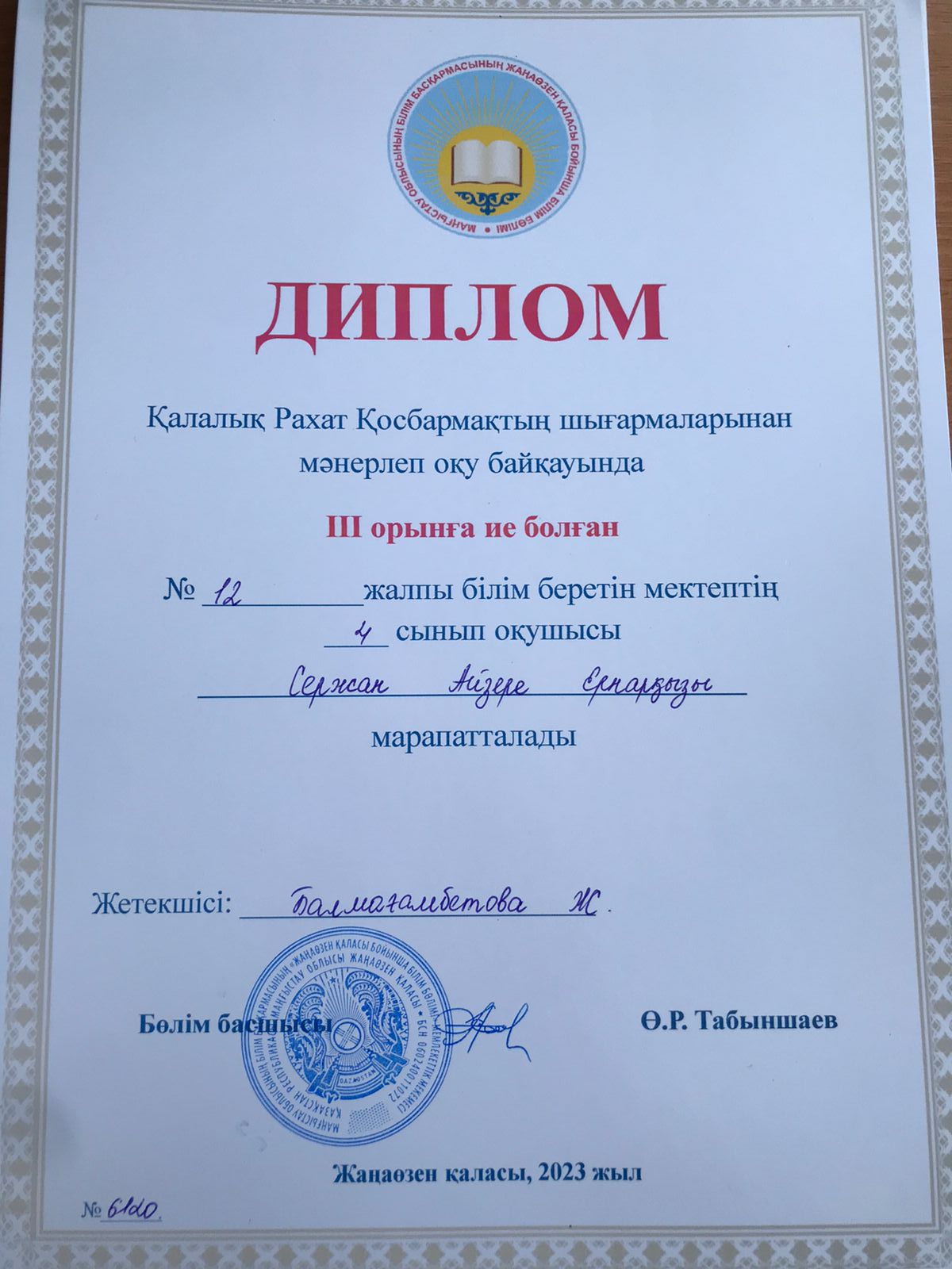 Мектебіміздің 4-ші "З" сынып оқушысы Сержан Айзере қалалық оқу әдістемелік орталығының ұйымдастыруымен өткізген жергілікті ақын Рахат Қосбармақовтың шығармаларын мәнерлеп оқу сайысына қатысып ІІІ орынмен марапатталды. Жетекшісі Балмағамбетова Жансауле.