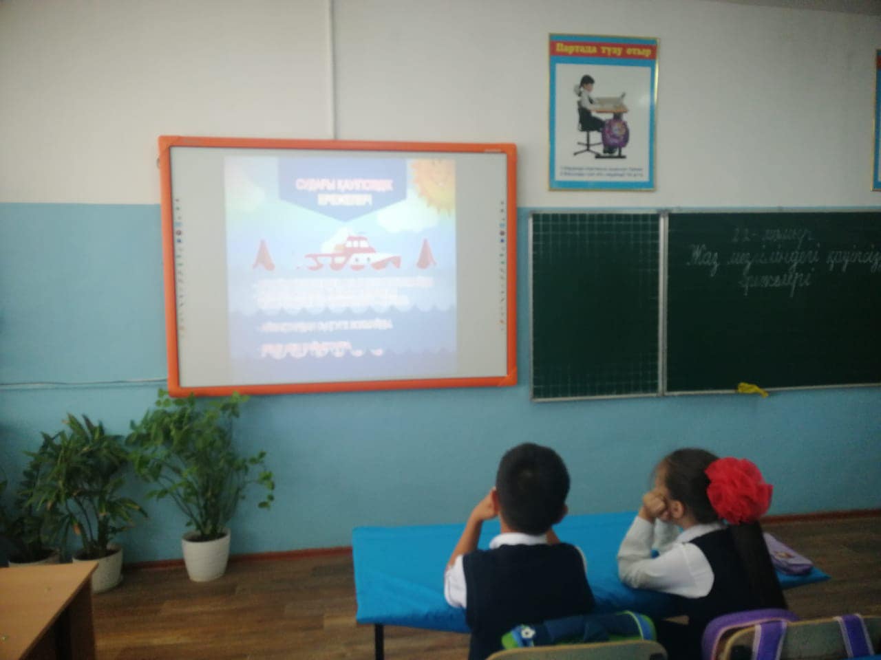 18-28 аралығындағы "Қауіпсіз білім беру ұйымы" онкүндігінің іс-шаралар жоспарына сәйкес 1-4-ші сыныптарда "Жаз айларындағы қауіпсіздік ережелері" тақырыбында сынып сағаттары өткізілді.
