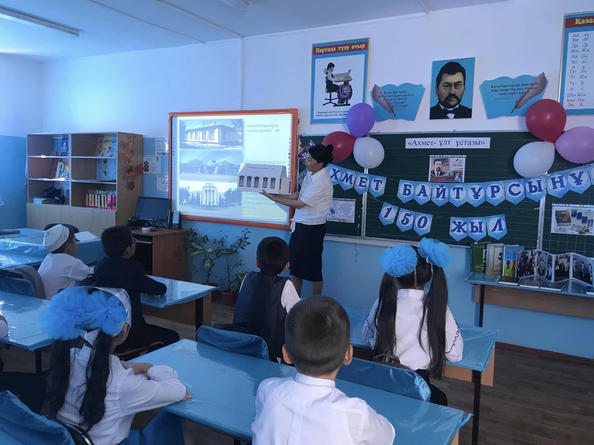 Мектебімізде Қазақстан халқы тілдері күніне және Ахмет Байтұрсыновтың туғанына 150 жыл толуына байланысты іс-шаралар жоспары жасақталып өткізілуде.Соның бірі 4-ші "Б" сынып жетекшісі Анетбаева Тілектестің сыныбымен өткізген "Ахмет - ұлт ұстазы" тақырыбындағы тәрбие сағаты.Тәрбие сағатында Ахмет Байтұрсынов өмірі мен шығармашылығы келер ұрпаққа мәңгілік өнеге болып қала беретінін, Ахмет Байтұрсынов рухына мәңгі бас иіп өтетінімізді түсіндірді.